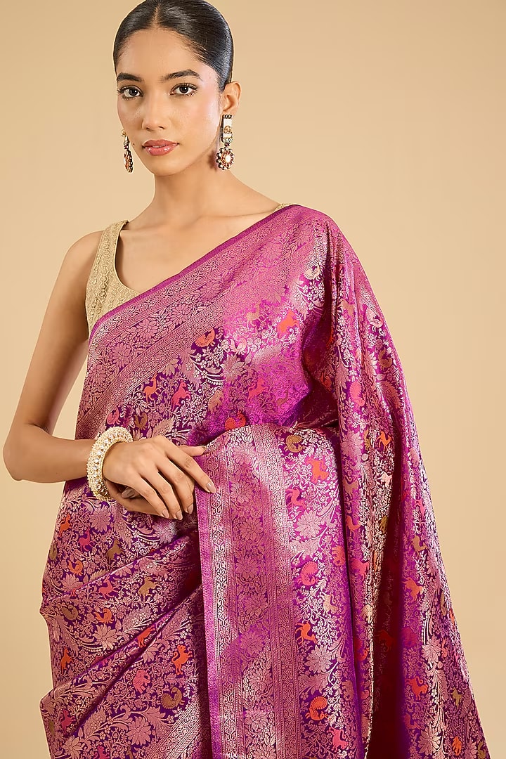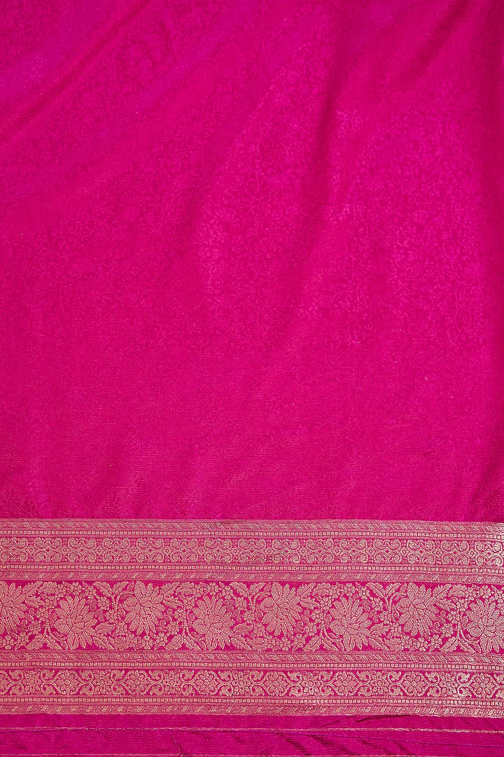The saree is distinguished by intricate wildlife-inspired designs woven across the fabric using luminous silver zari. This unique detailing gives the saree a luxurious, heirloom quality and a captivating narrative. The cool silver work provides a stunning contrast to the intense pink, enhancing its visual depth and sophistication.