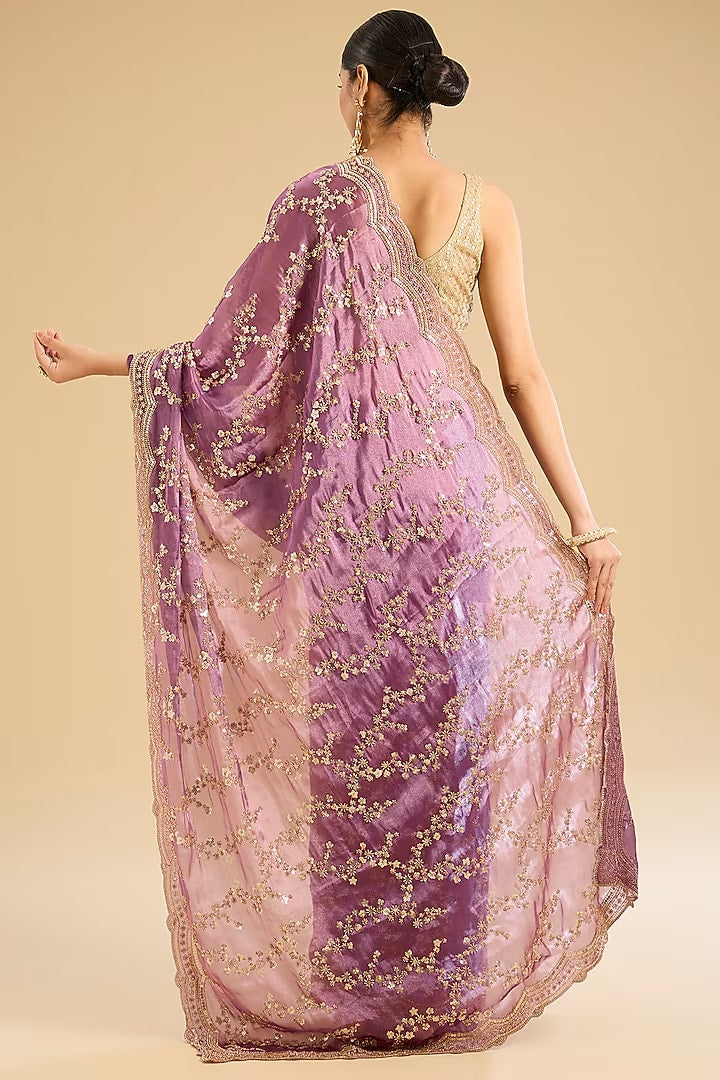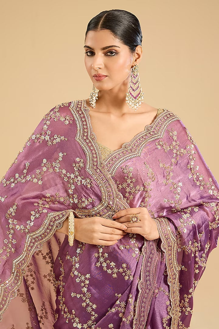 Drape yourself in the sophisticated shimmer of The Amethyst Sparkle: Purple Glass Tissue Saree with Scalloped Cutwork. Crafted from airy glass tissue fabric, the saree has a unique, subtle transparency and a glossy finish in a rich purple hue that beautifully reflects light.
