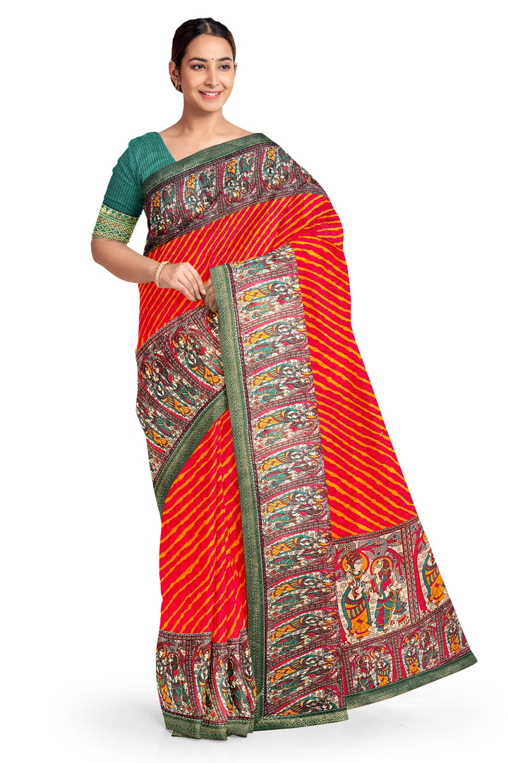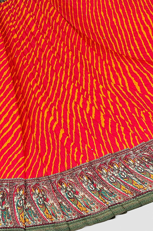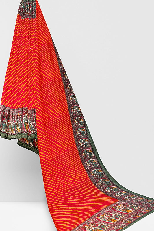 The saree showcases the fluid, diagonal patterns of the traditional Lahariya printed stripes in a contrasting Mustard color, creating a beautiful blend of tradition and simplicity.