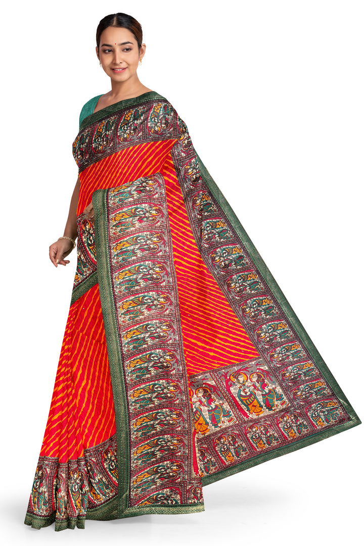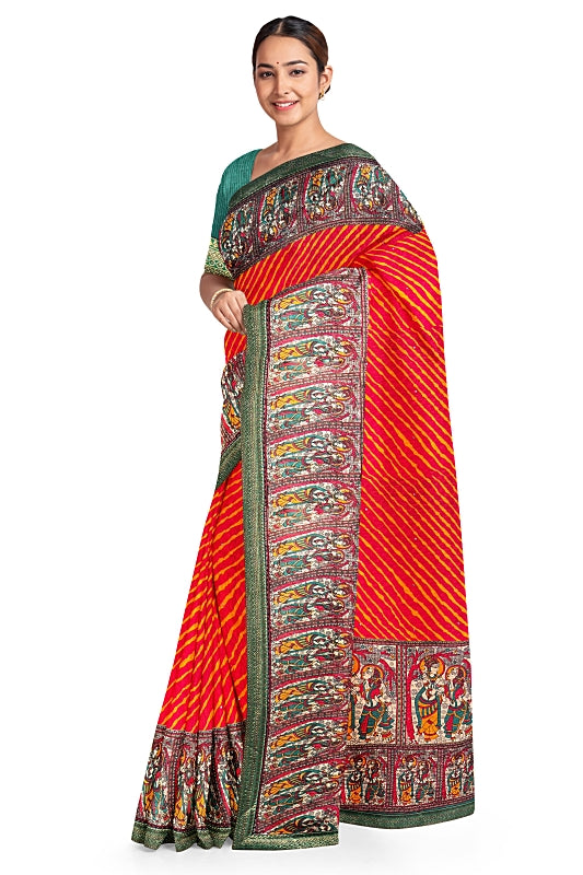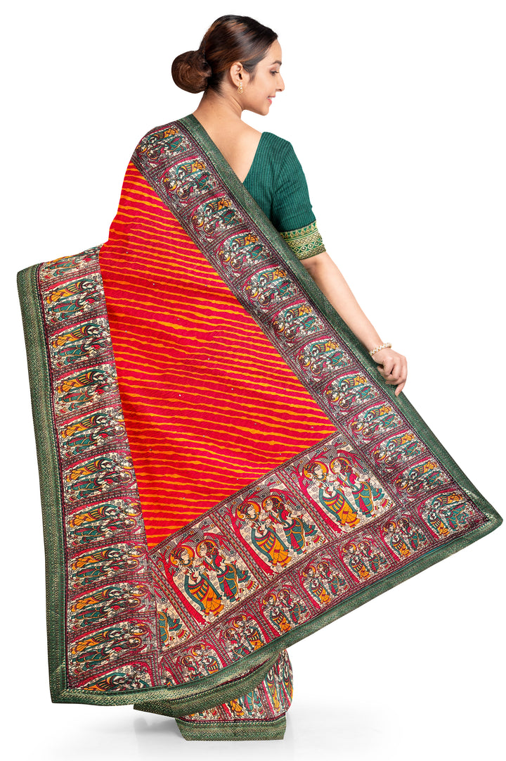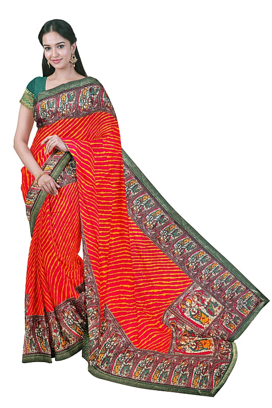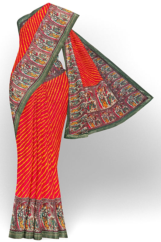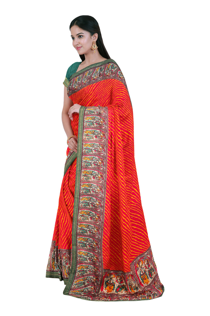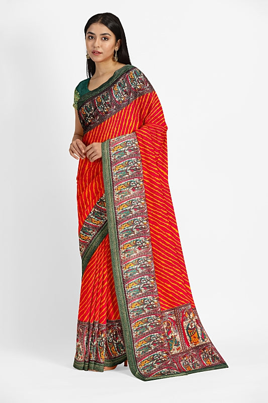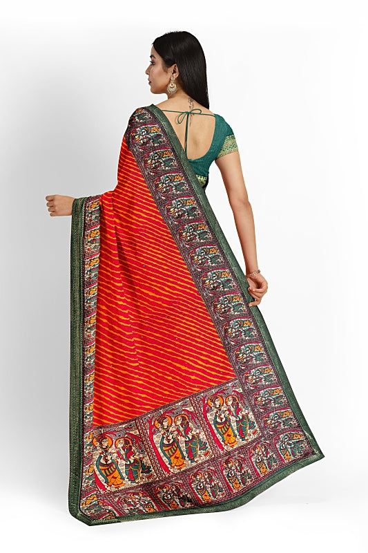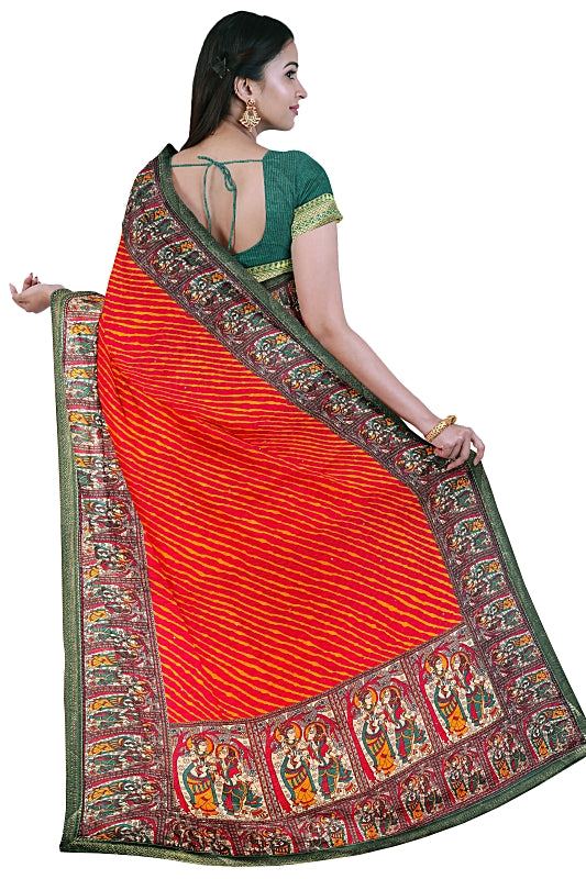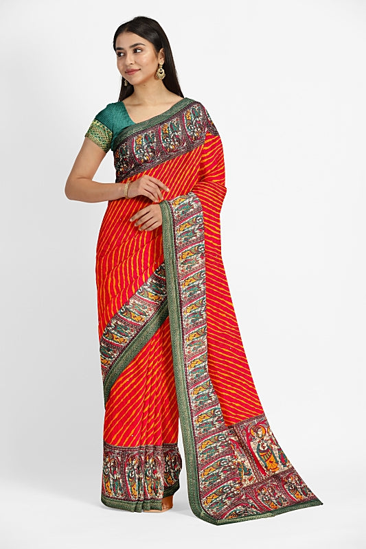 Crafted from soft, lightweight georgette, the saree offers a comfortable, effortless drape in a striking Red hue.