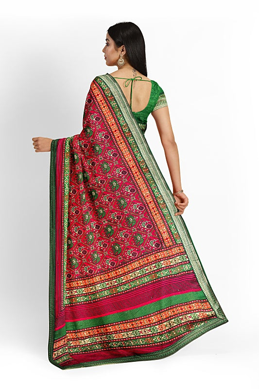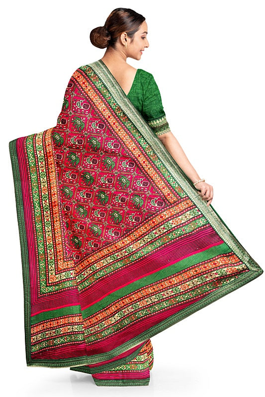 The saree features classic Bandhej prints across the body, highlighted by a colourful pallu adorned with intricate wildlife motifs in striking Parrot Green and Mustard. Light sequins work subtly completes its elegant look.