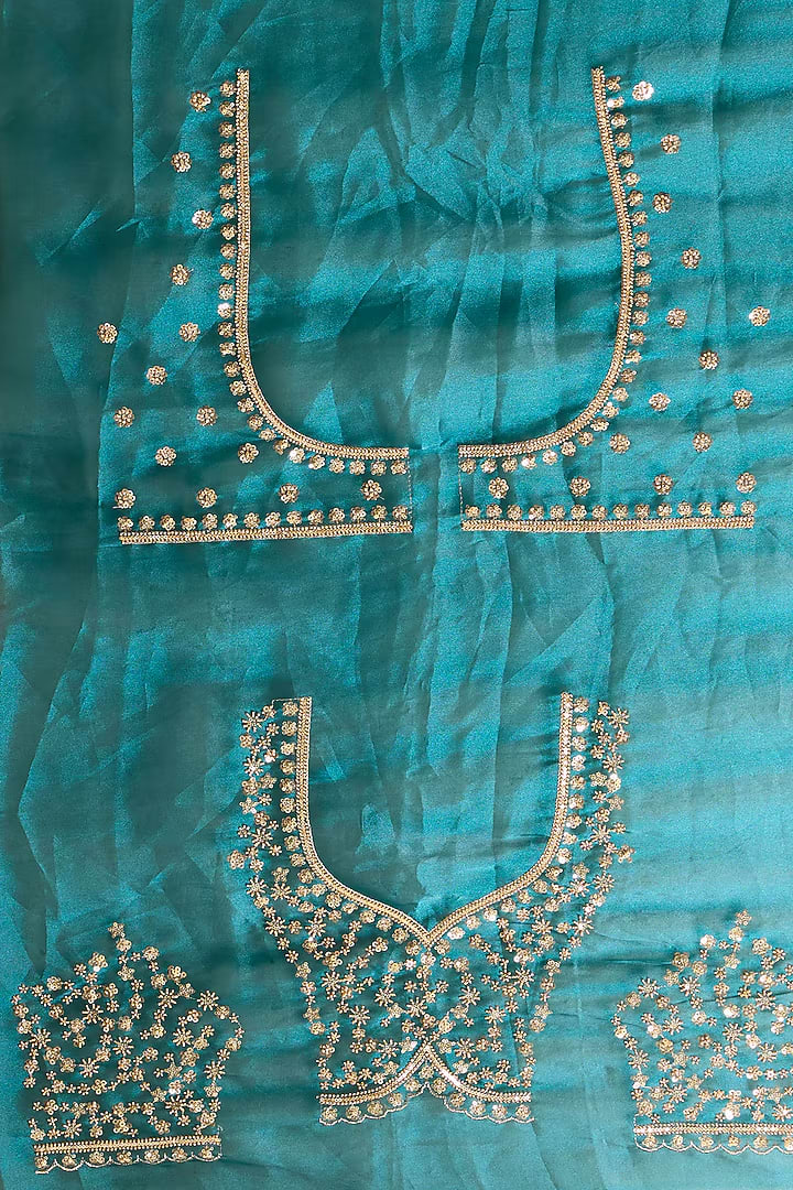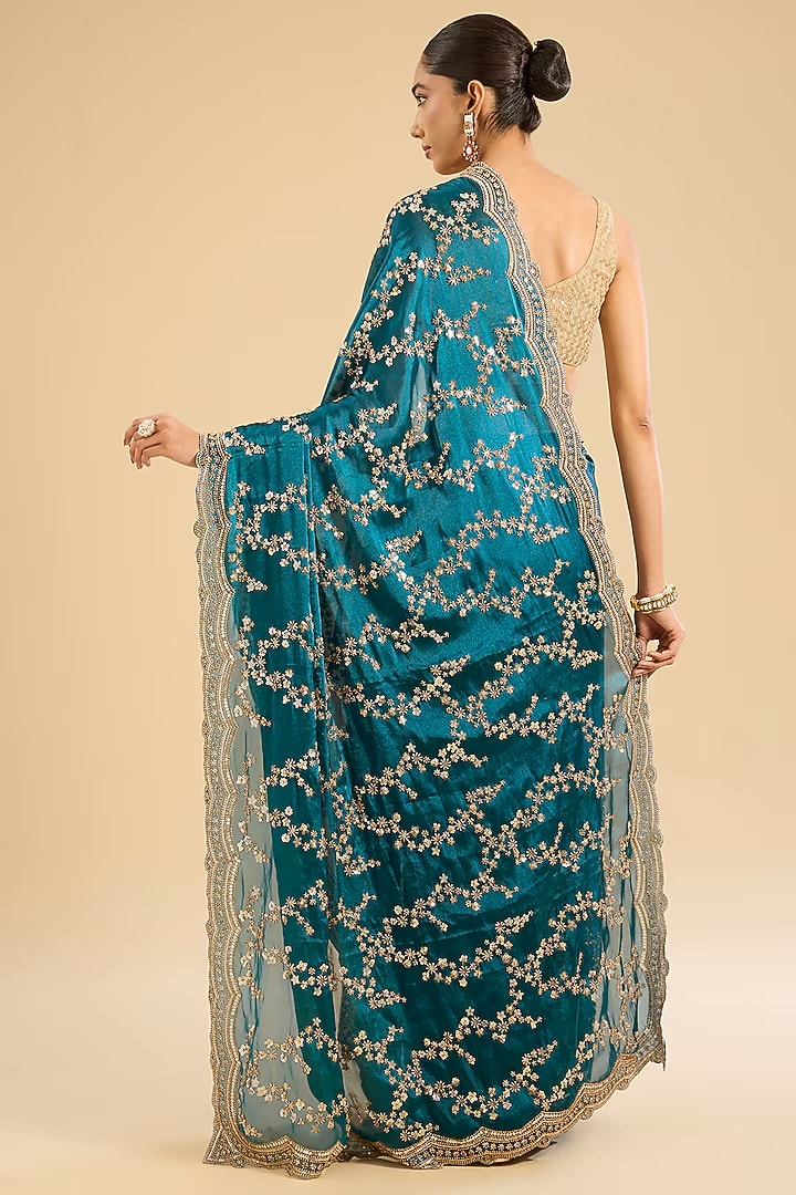 Crafted from airy glass tissue fabric, the saree has a unique, subtle transparency and a glossy finish that beautifully enhances the deep, jewel-toned Peacock Blue hue.