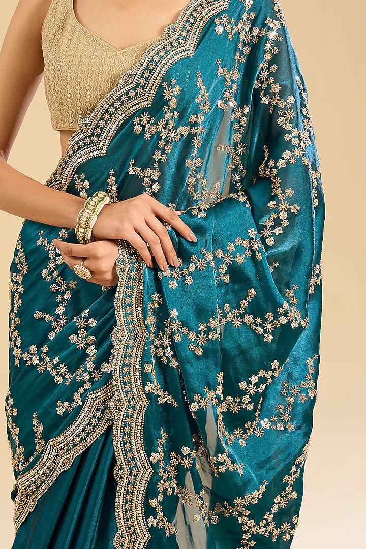 The Crystal Peacock: Peacock Blue Glass Tissue Saree with Cutdana Work