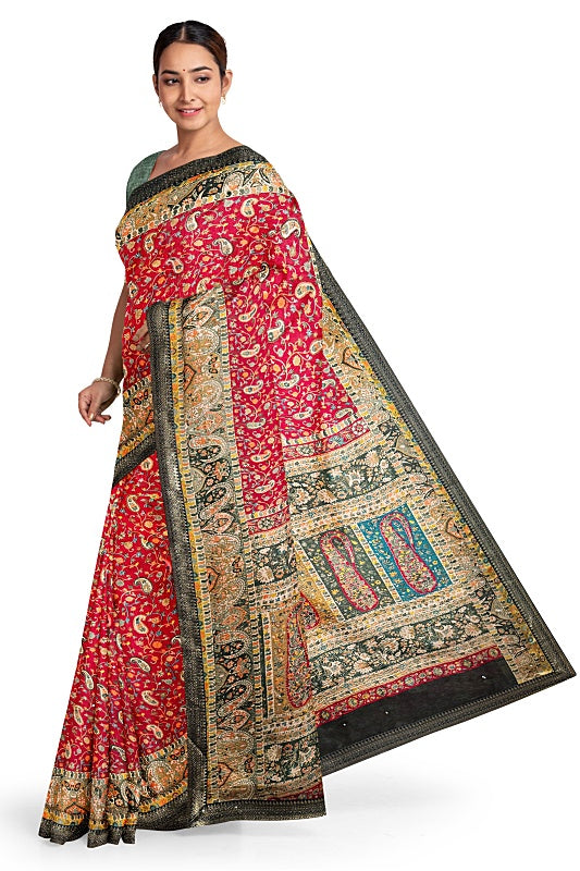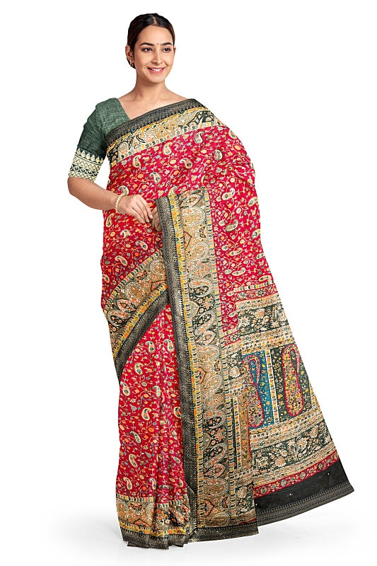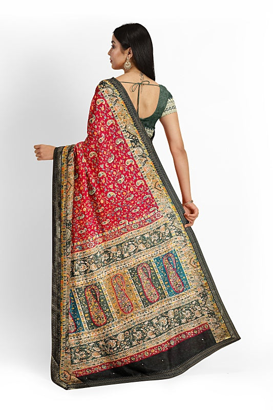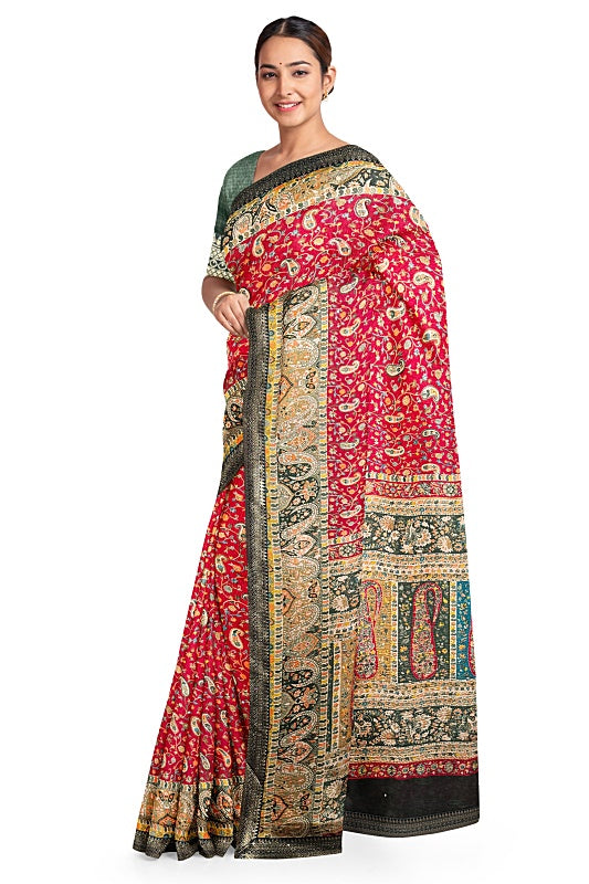 The saree features intricate Jaal Ambi prints and is framed by a stunning jewel-toned Teal Blue-Green border. It is enhanced with sequins work throughout, offering a stylish yet understated shimmer.