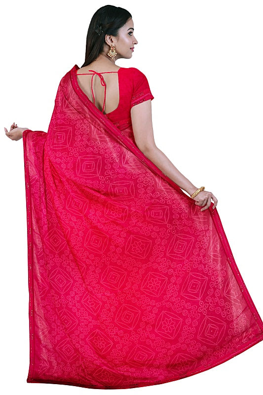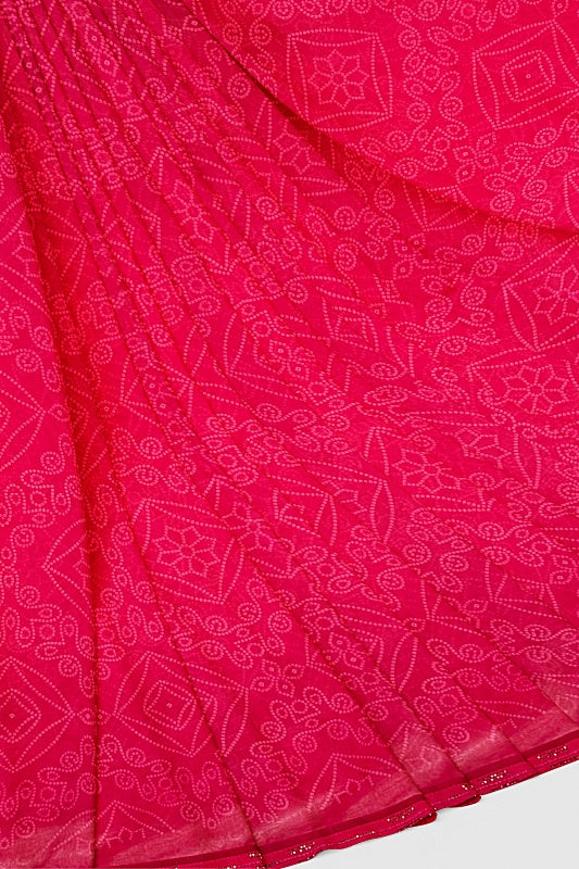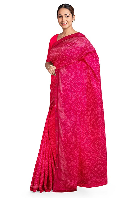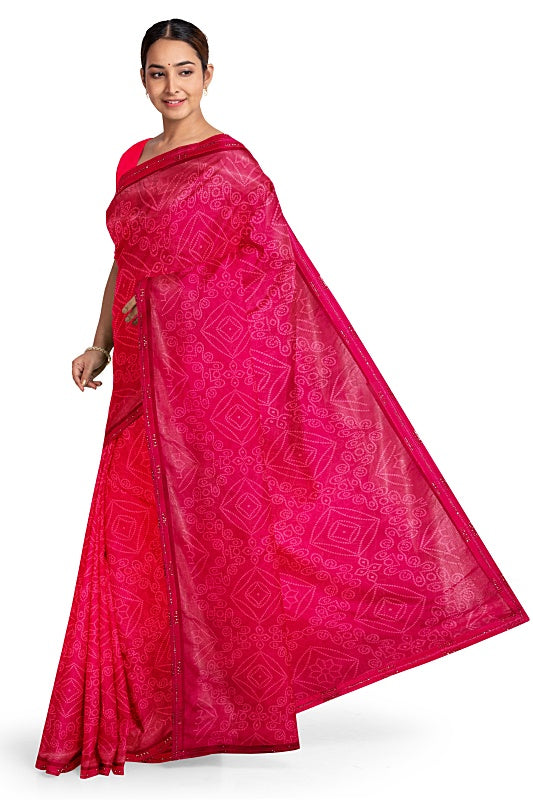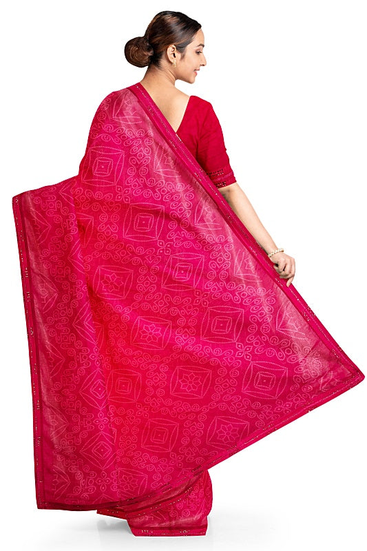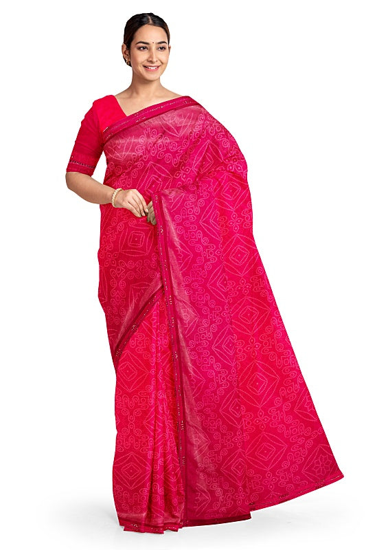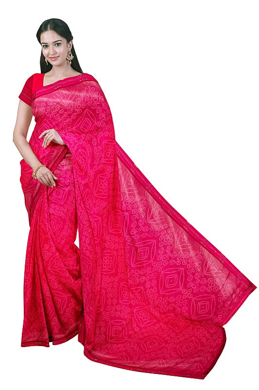 The saree showcases the intricate patterns of the traditional Bandhej (tie-dye) technique, providing rich texture and cultural charm for a vibrant, traditional look.