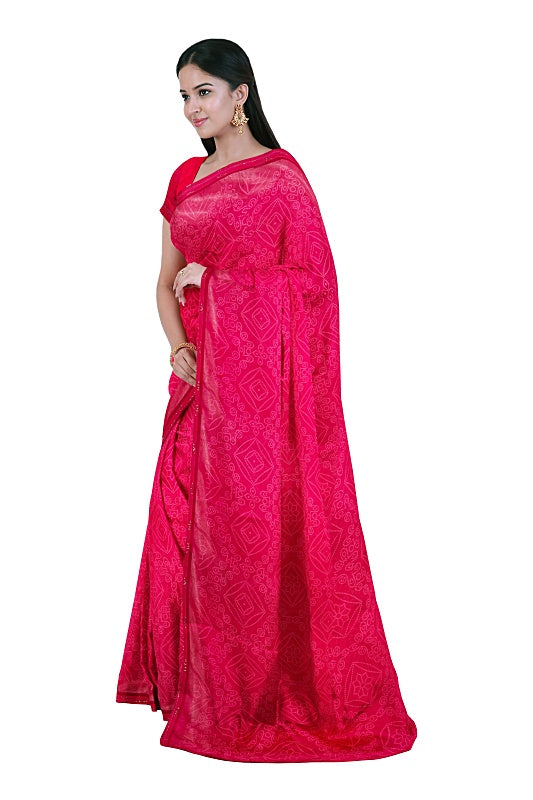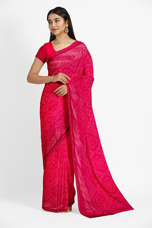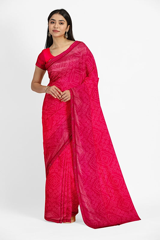 Crafted from soft, lightweight georgette, the saree offers a comfortable, effortless drape in a striking Fuchsia hue.