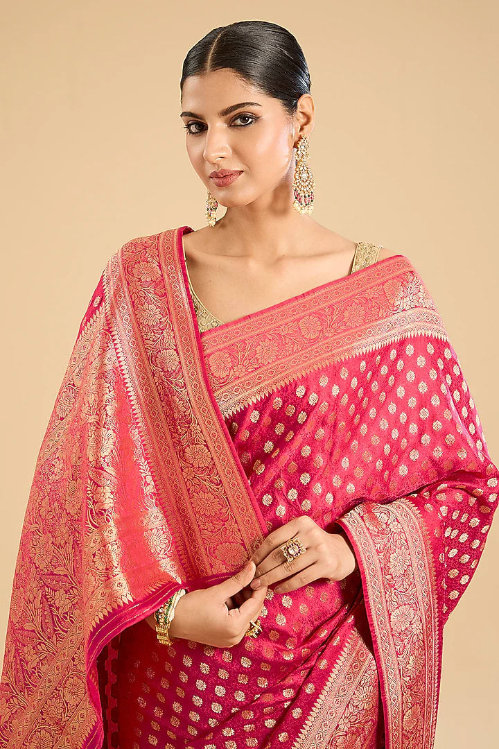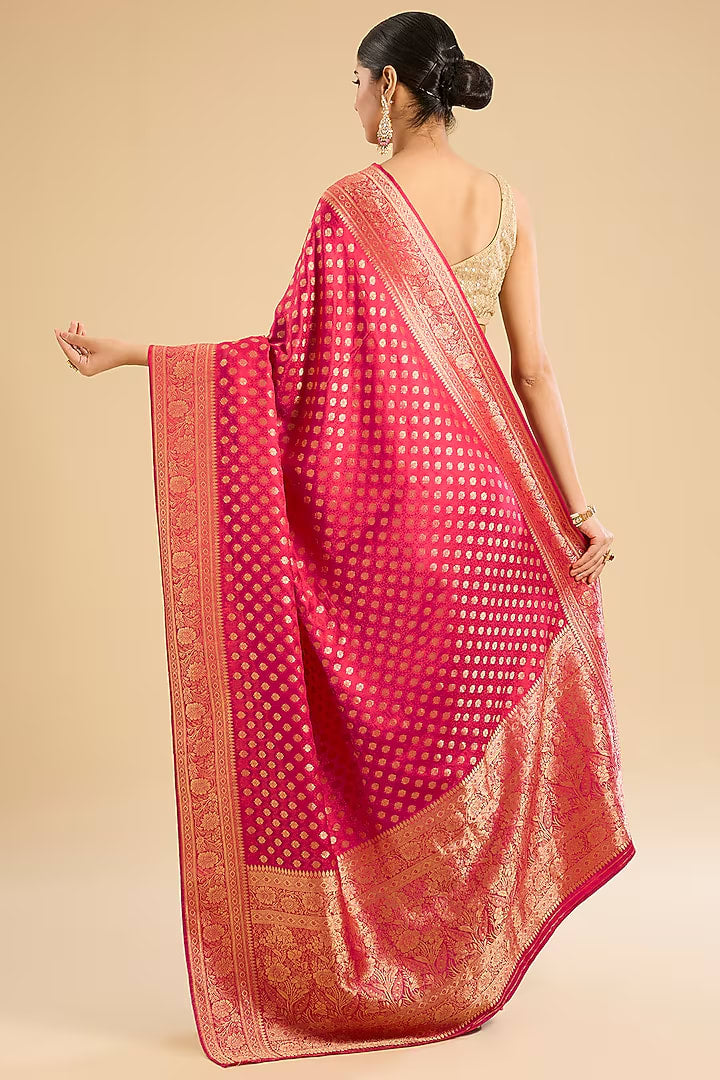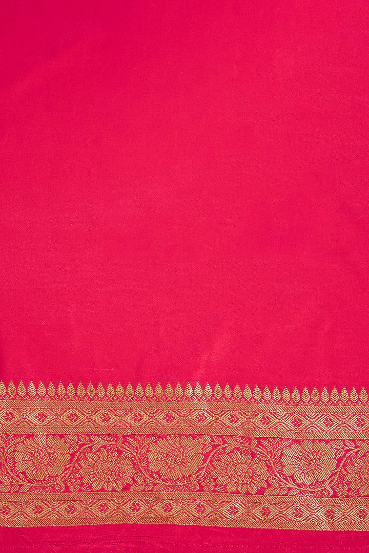 The Fuchsia Empress: Rani Pink Satin Silk Banarasi Saree with Golden Zari Motifs