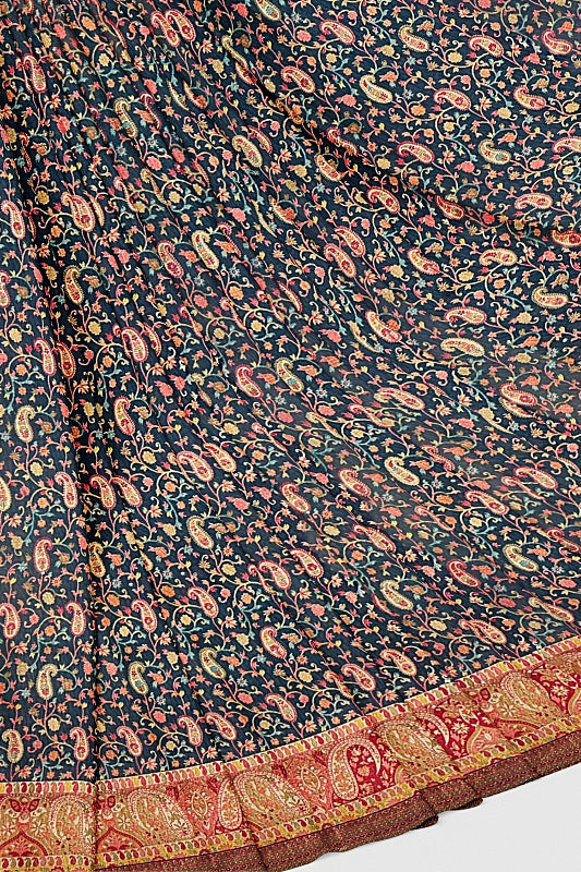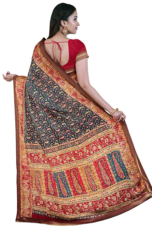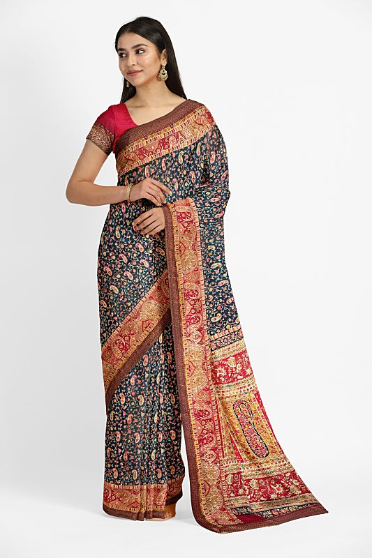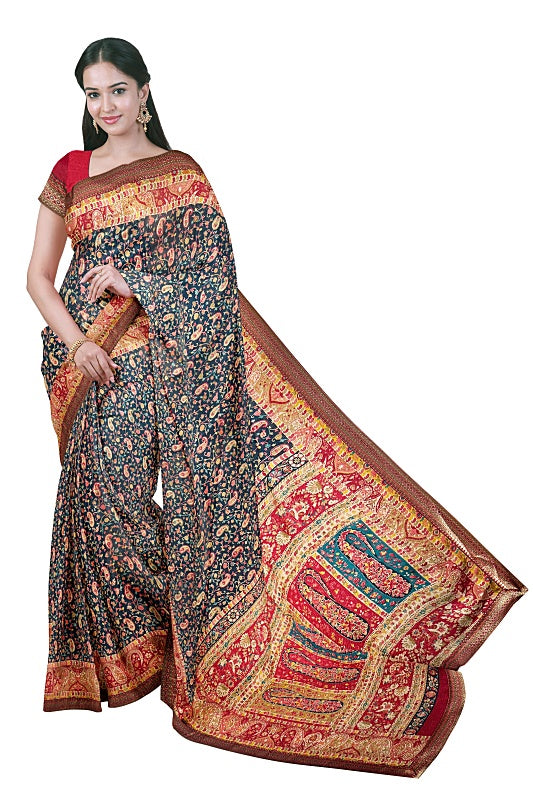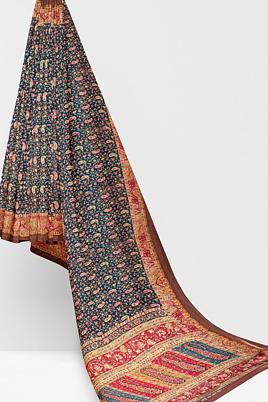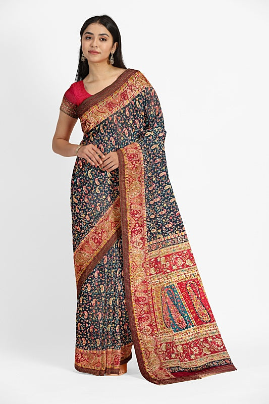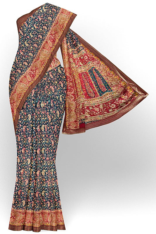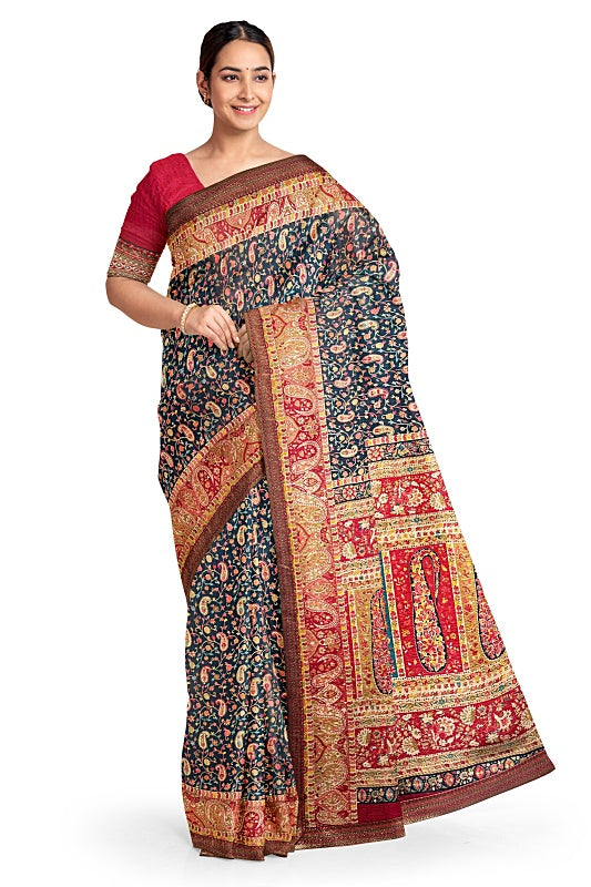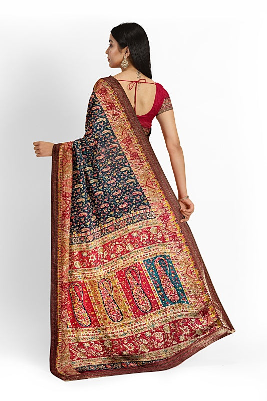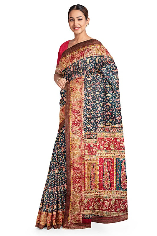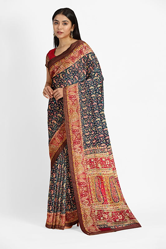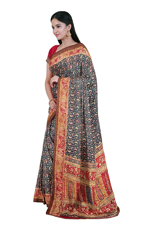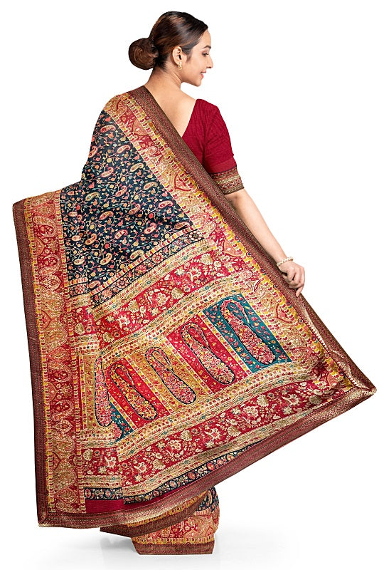 The saree is styled with rich, jewel-toned Jaal Ambi prints featuring deep Red and Black tones, accented with delicate sequins work for a subtle shimmer.