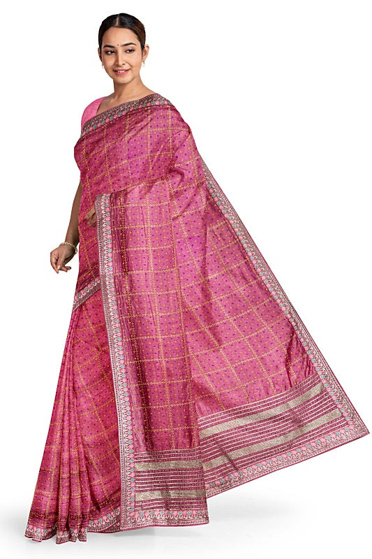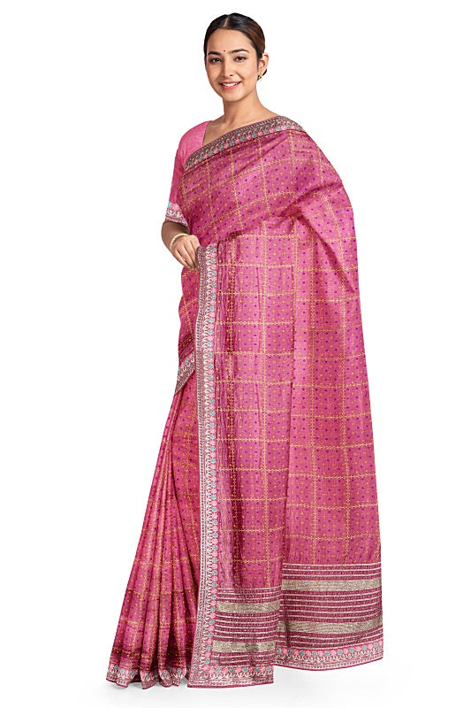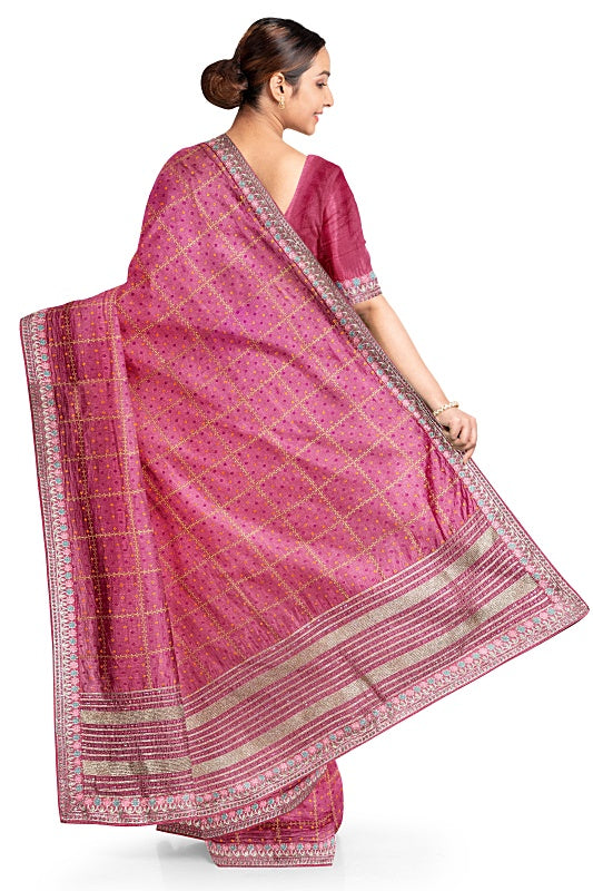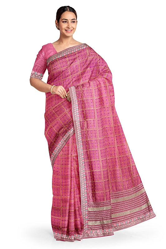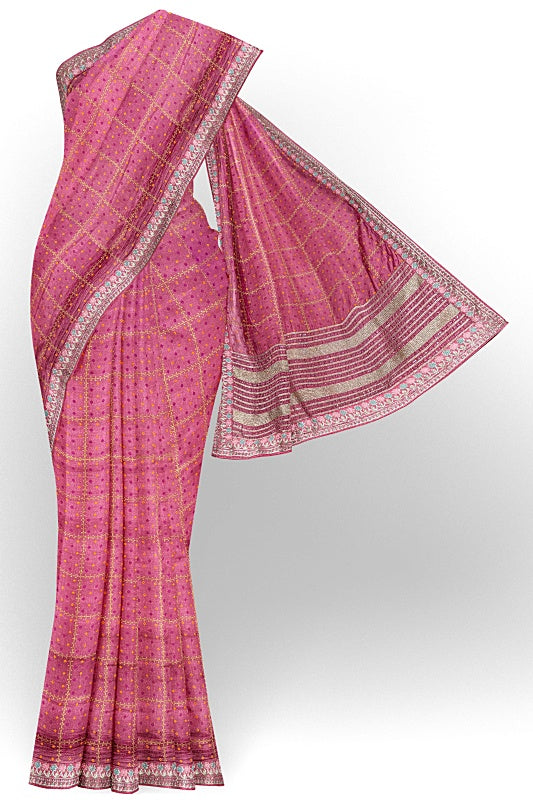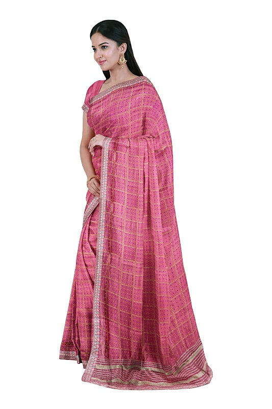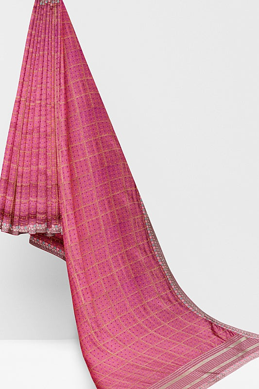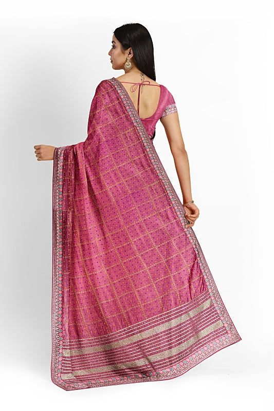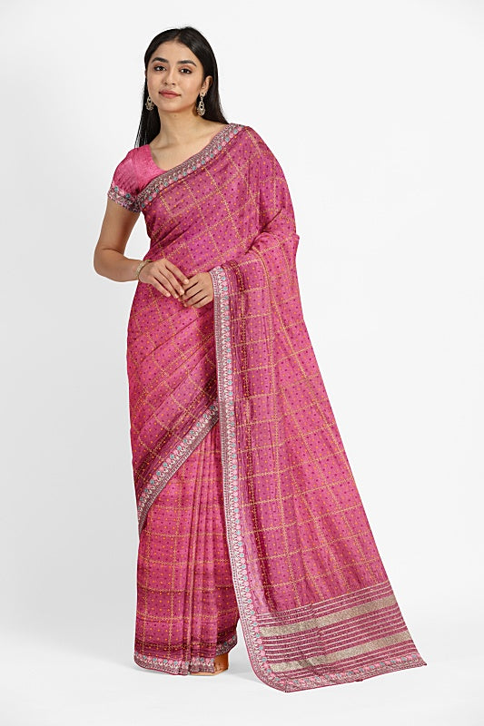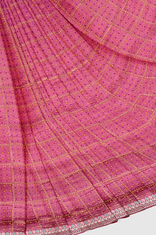 The Peony Whisper: Coral Pink Georgette Saree with Bandej and Resham