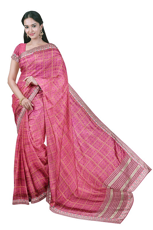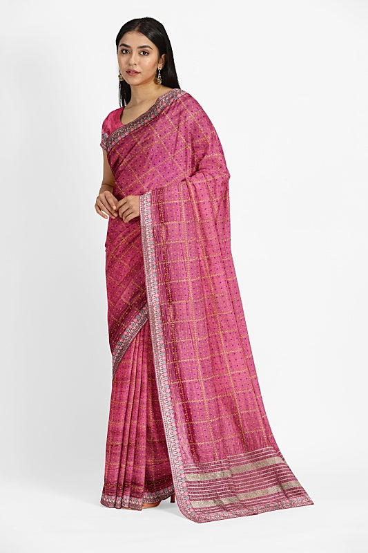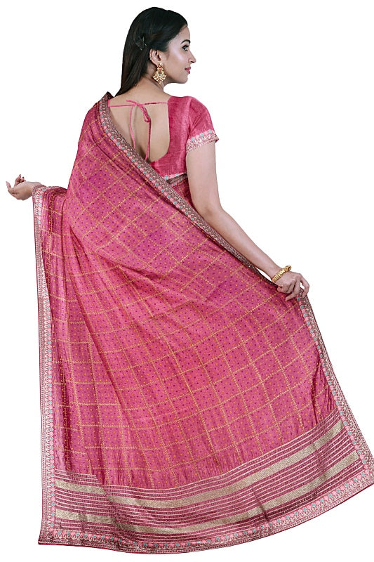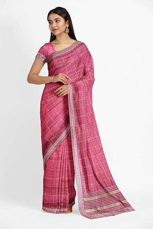 The saree features traditional Bandej prints that provide lovely texture, complemented beautifully by soft Resham thread work detailing. Subtle Swarovski accents are scattered across the fabric, providing a hint of sparkle without overpowering the saree's simple elegance. This mix of traditional craft and comfortable fabric makes it the perfect blend of style and ease.