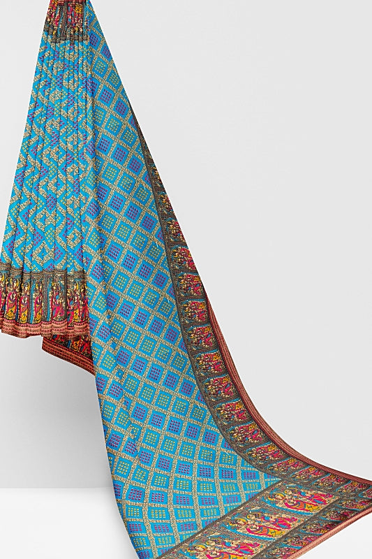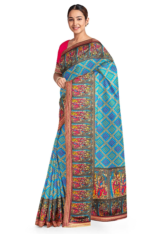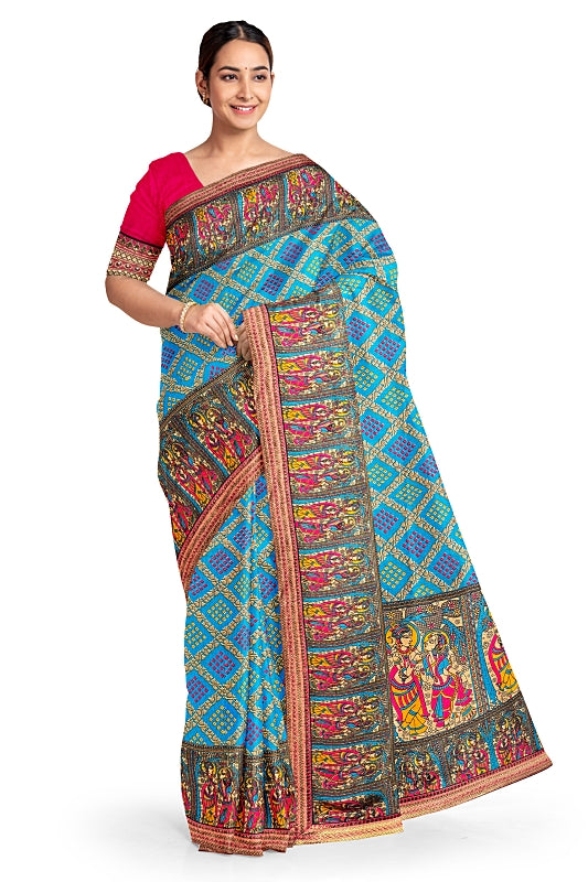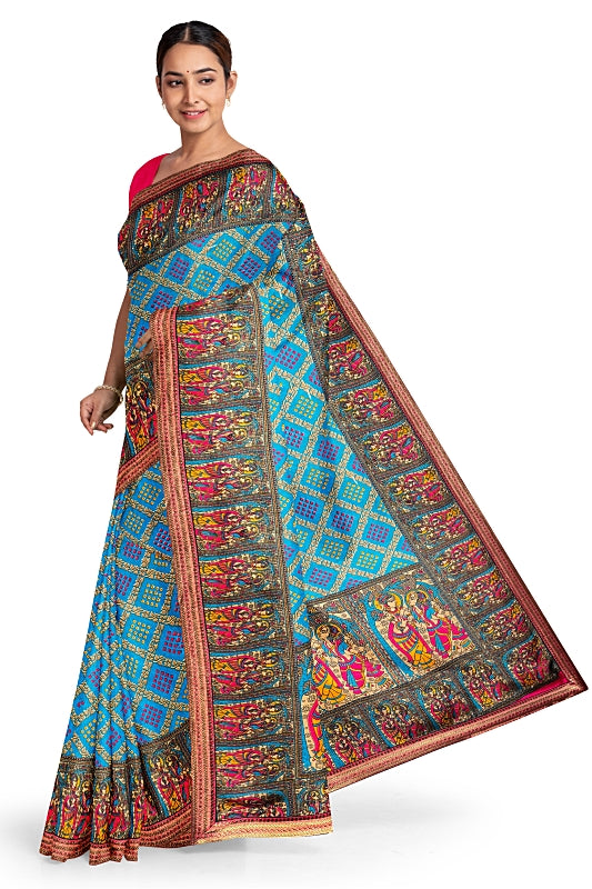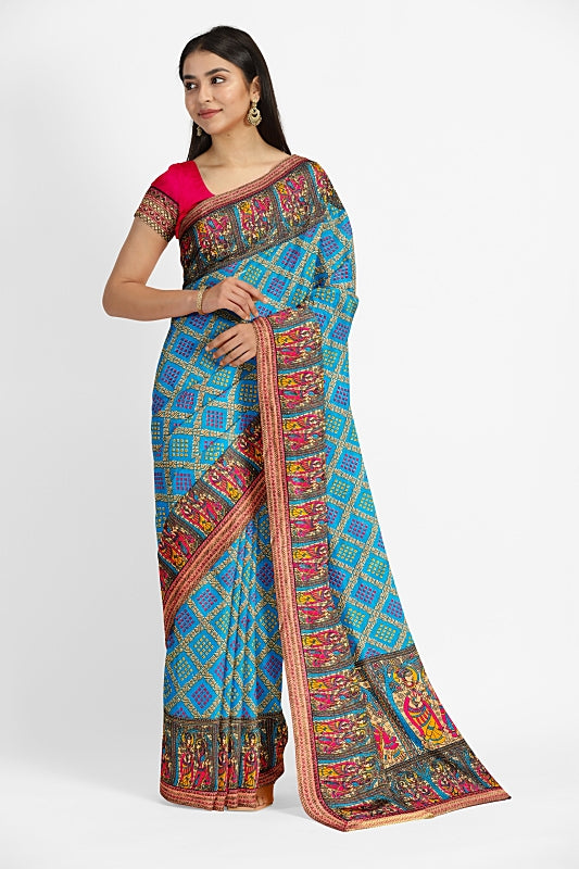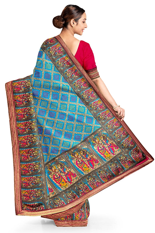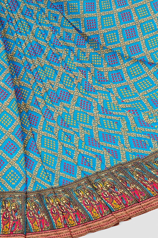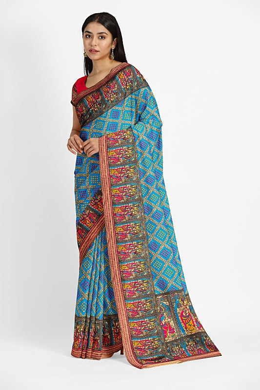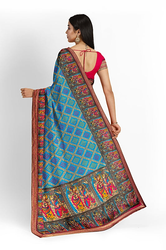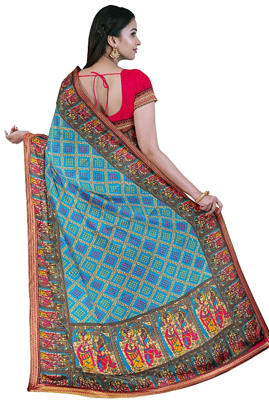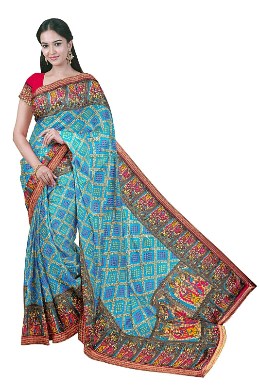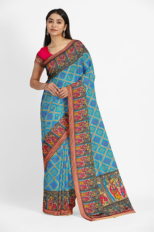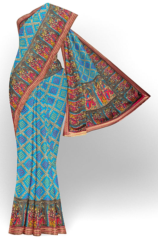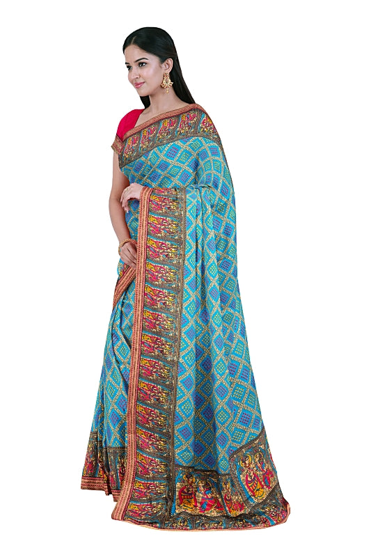 The Pure Devotion: Radha Krishna Motif Border Blue Georgette Bandej Saree