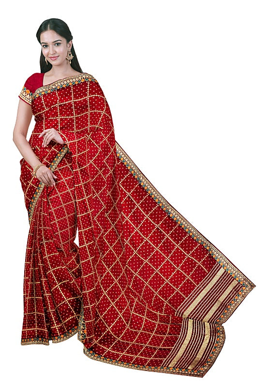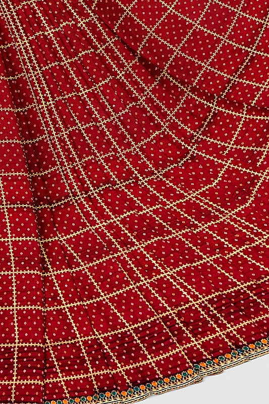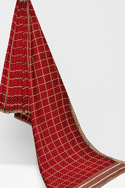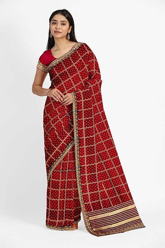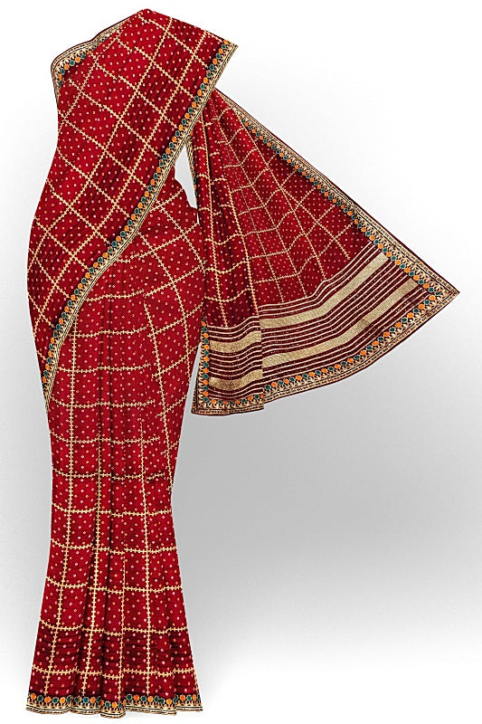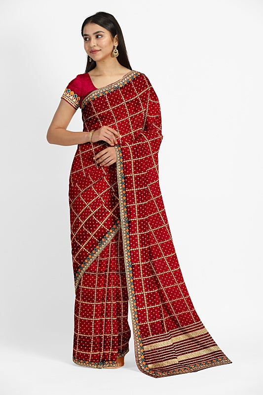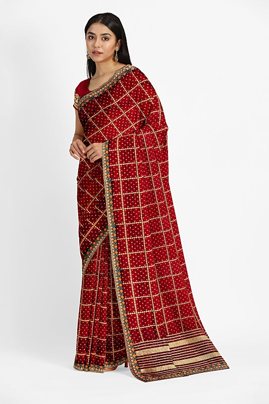 The saree features traditional Bandej prints that provide texture and visual interest, perfectly complemented by delicate Resham thread work. Subtle Swarovski accents are scattered across the fabric, providing a hint of sparkle without being overpowering. This balance of traditional craft and minimal embellishment makes the saree both unique and versatile.