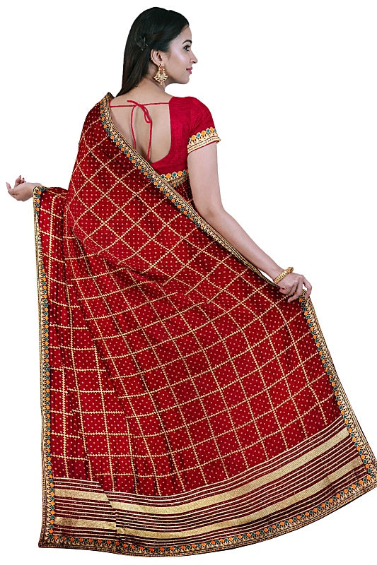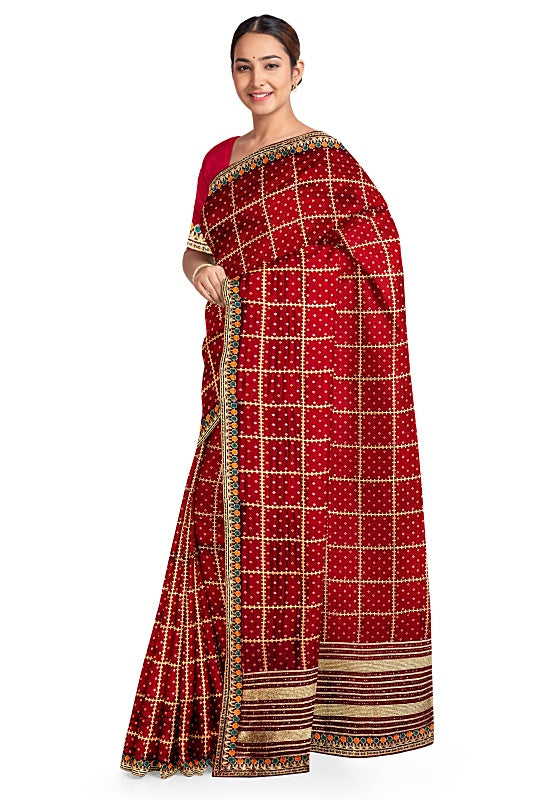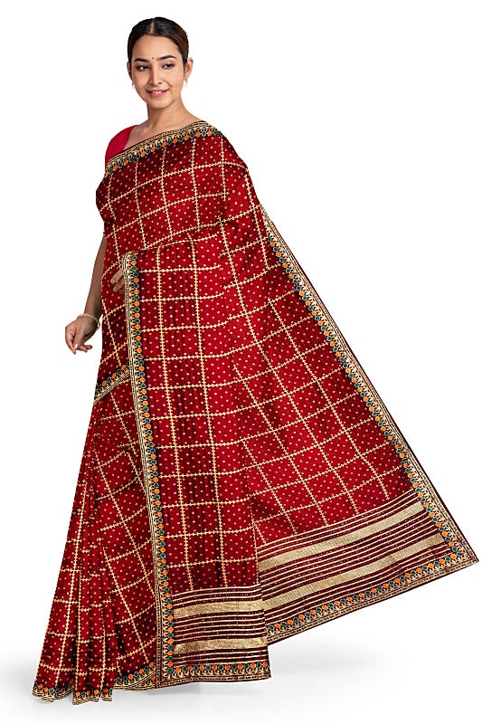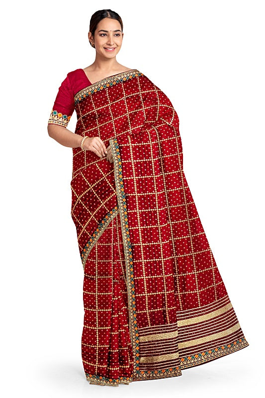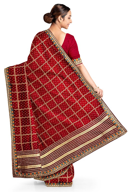 Crafted from light and flowy georgette, the saree offers a comfortable, graceful drape in a rich maroon hue.