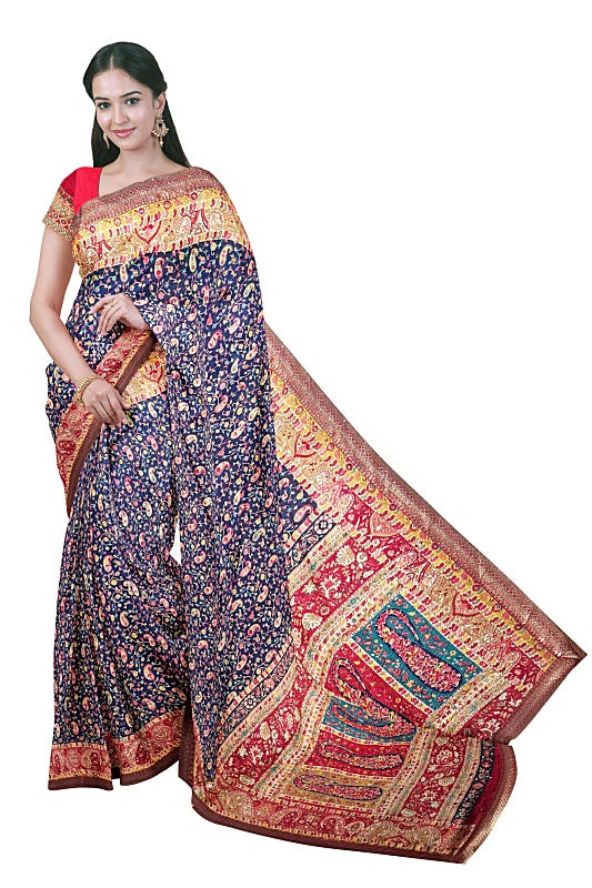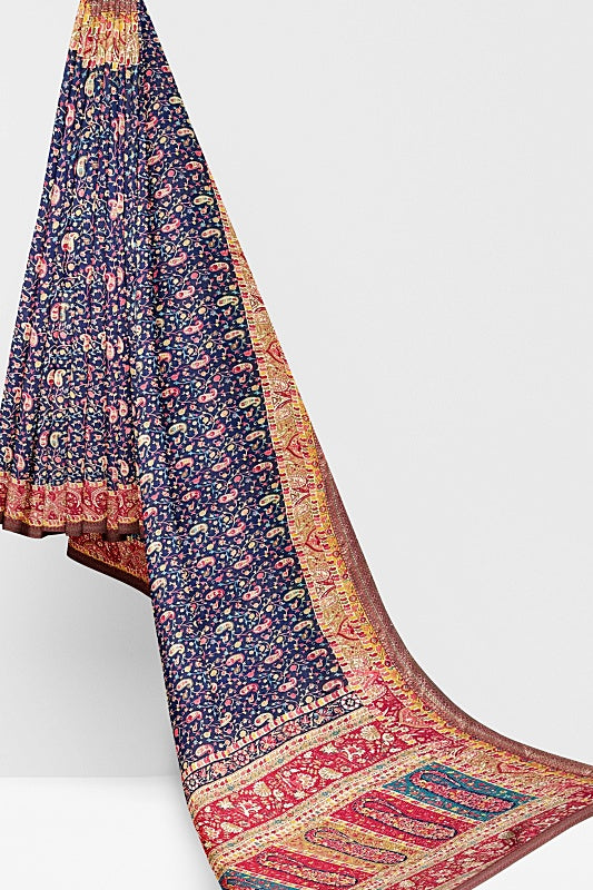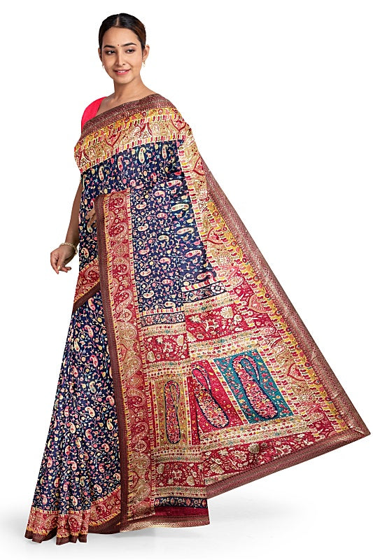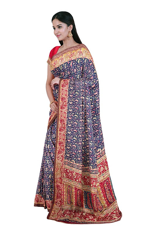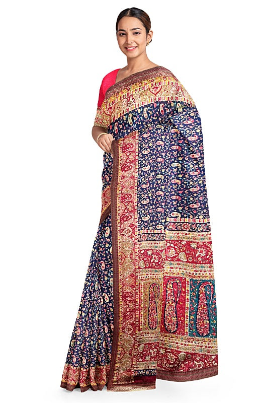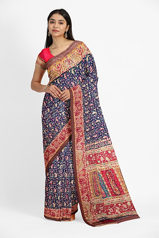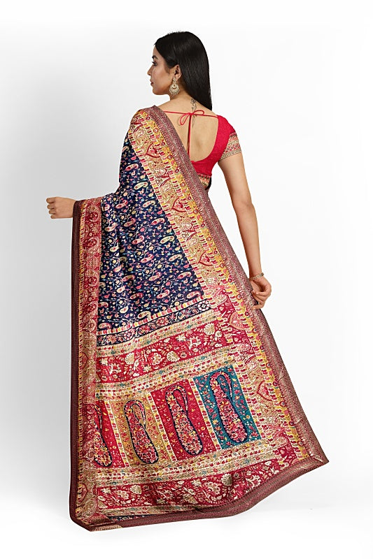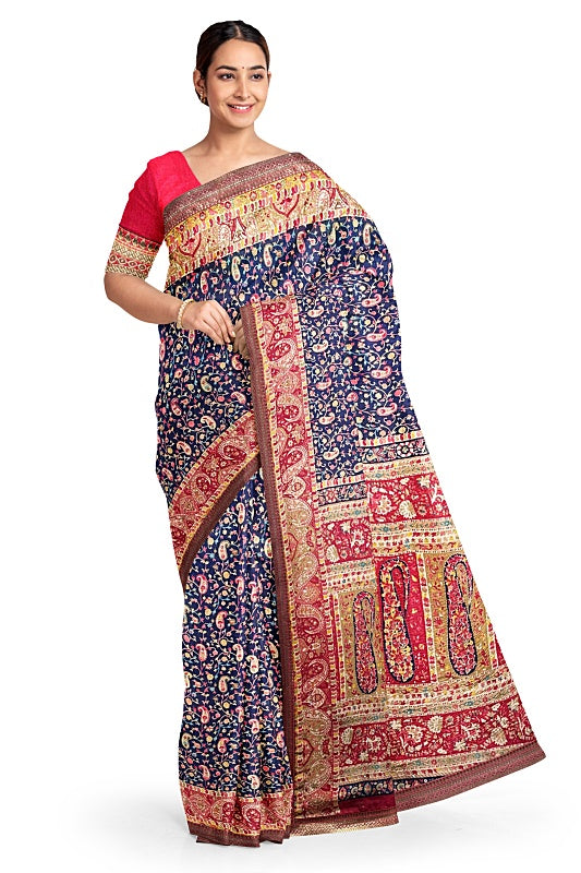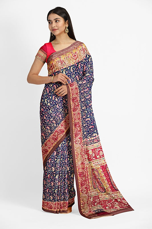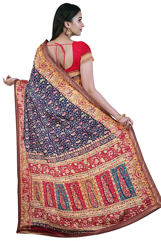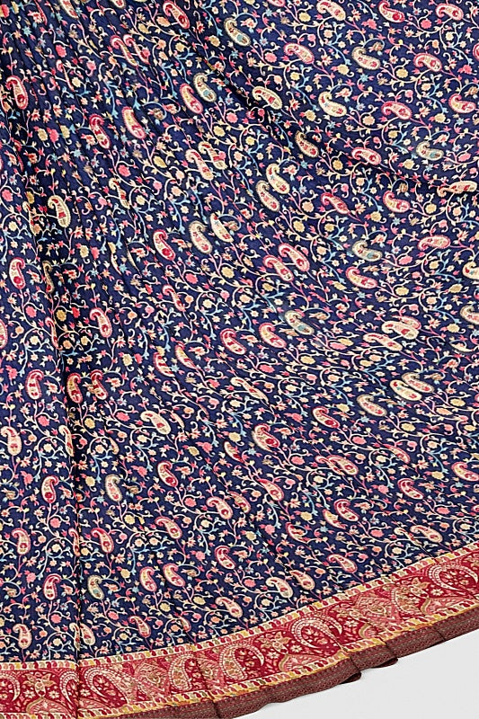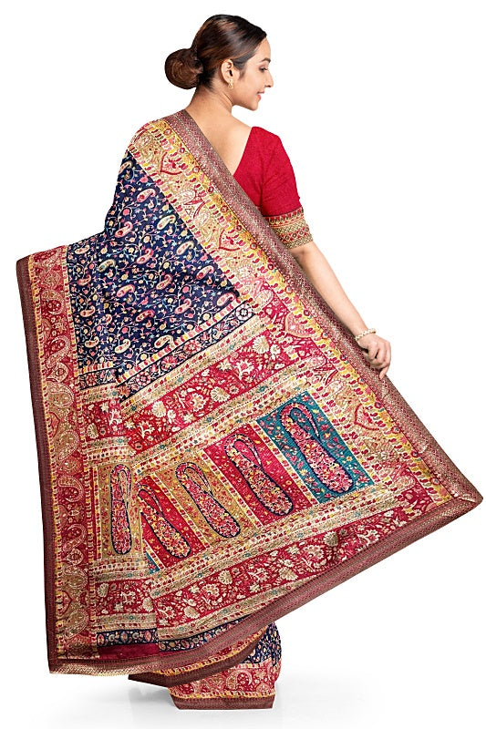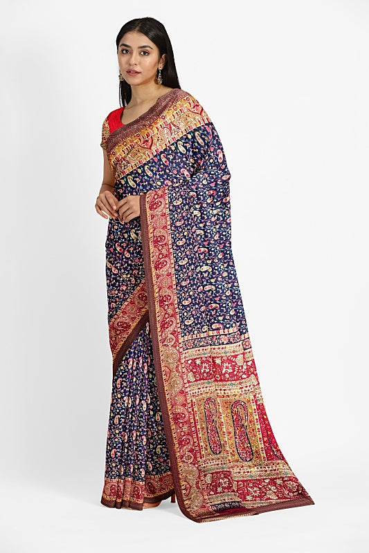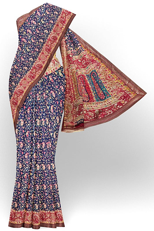 The saree is adorned with a rich, jewel-toned Jaal Ambi print featuring deep Red and Blue tones. Subtle sequins are scattered throughout the design, offering a delicate touch of sparkle.