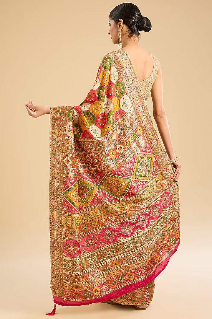 The Silk Kaleidoscope: Multi-Colored Satin Silk Saree with Mirror and Zari Work