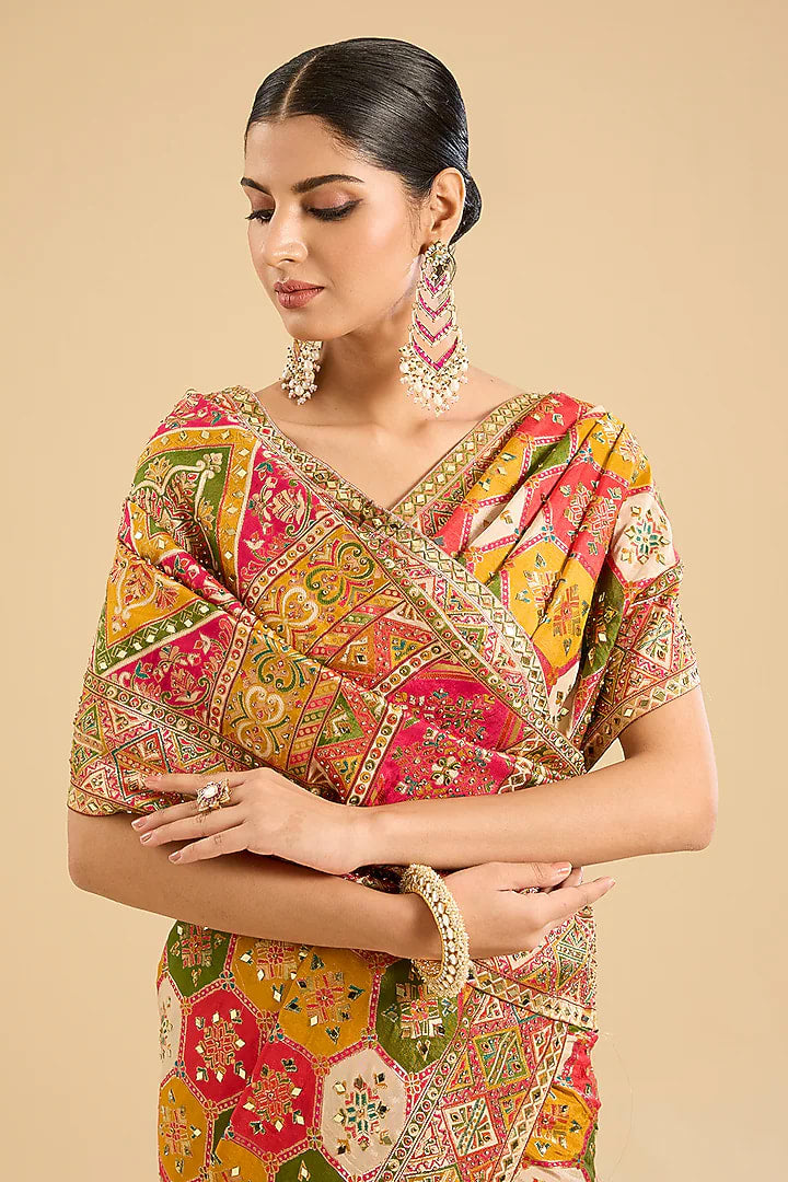 Turn heads with this magnificent Multi-Colored Satin Silk Mirror Embellished Saree Set. Crafted from luxurious satin silk, the fabric offers a fluid, flattering drape and a beautiful sheen that enhances the vibrancy of its multi-hued palette.