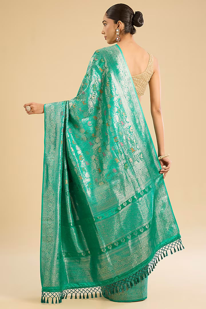 The Silver Safari: Teal Satin Silk Wildlife Zari Saree