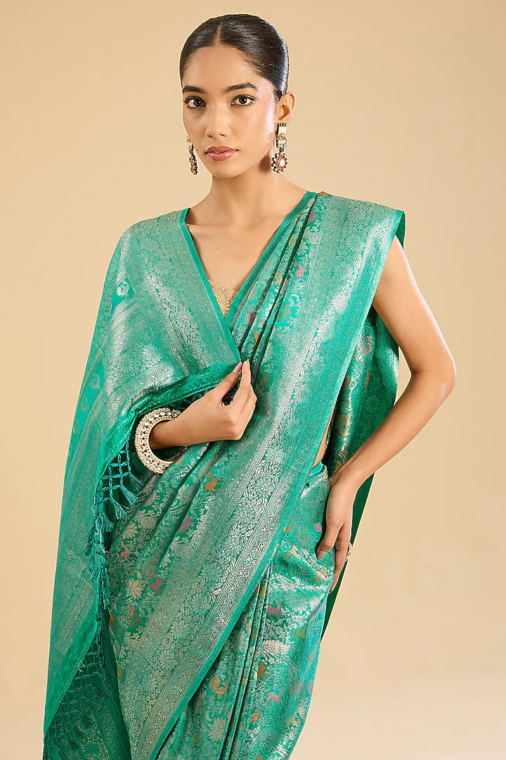 The fabric is distinguished by detailed wildlife motifs that are woven across the body using luminous silver zari. This traditional yet unique detailing gives the saree a luxurious, heirloom quality and a fascinating story. The silver work contrasts beautifully with the deep teal, enhancing its jewel-toned depth.