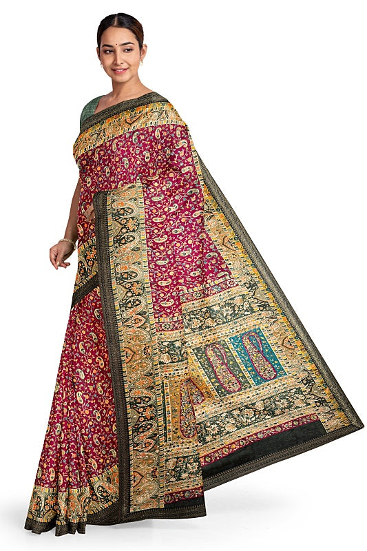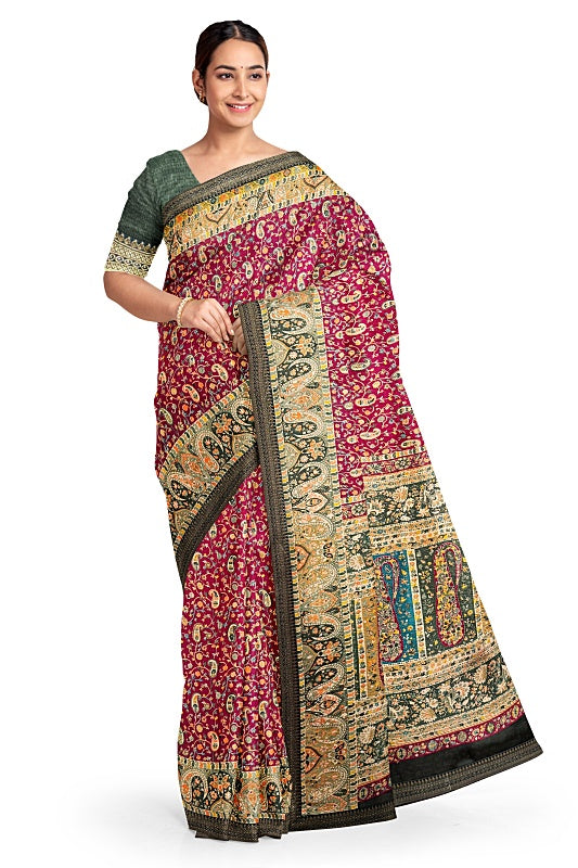 The saree is highlighted with sophisticated Jaal Ambi prints and features a contrasting Olive Green border. Subtle sequins detailing is added throughout, providing a soft shimmer.
