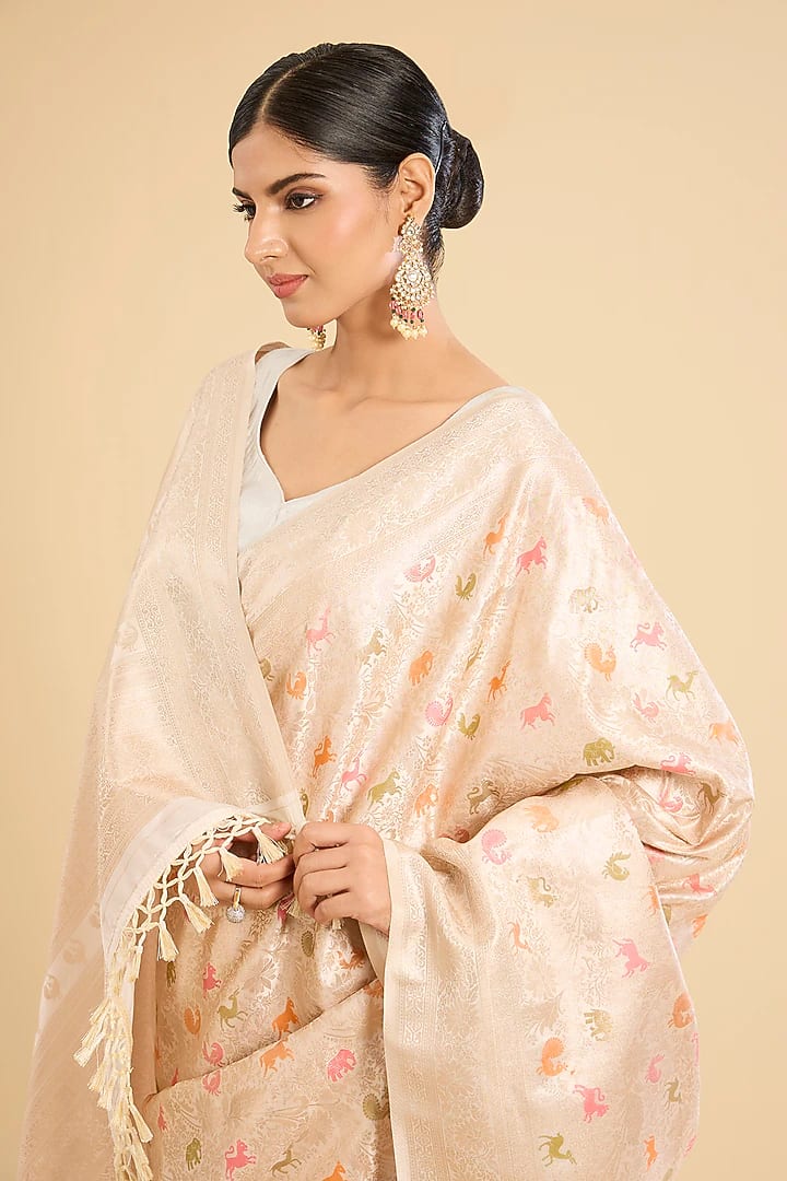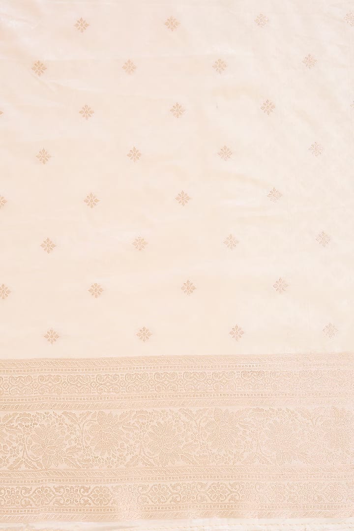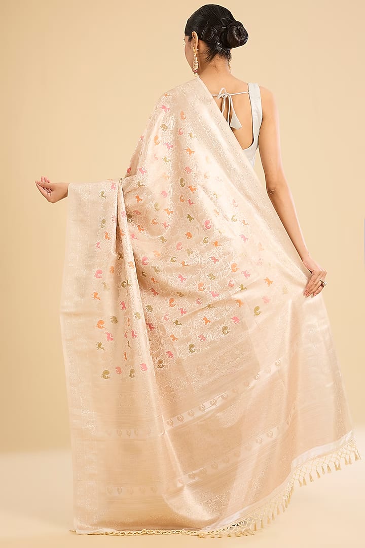 The fabric is richly detailed with traditional silver zari weave, which creates an intricate, shimmering pattern across the saree. This elegant metallic detailing contrasts beautifully with the soft yellow, giving the ensemble a sophisticated yet joyful appearance.